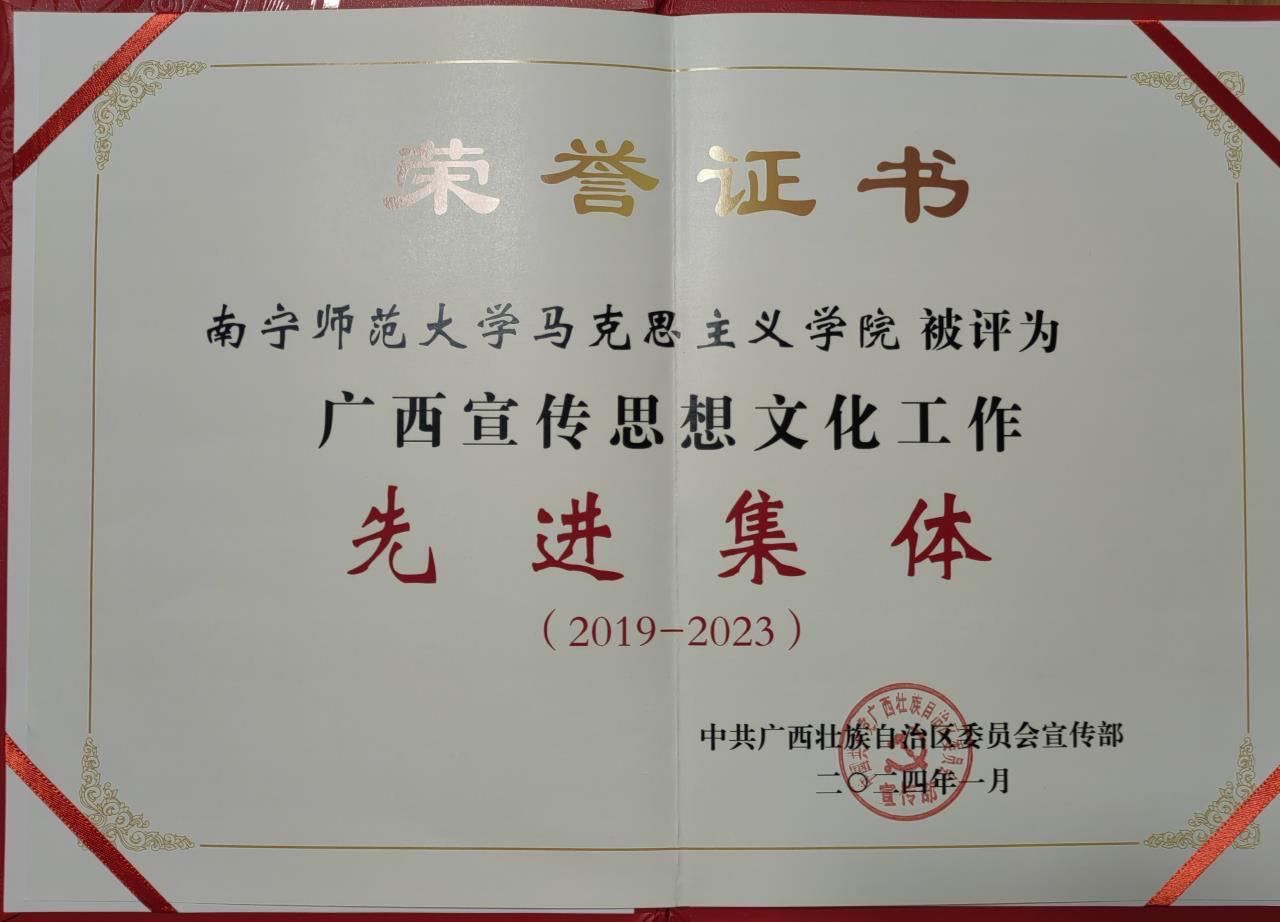 近日,为表彰先进、树立典型,弘扬正气、激励斗志,汇聚起建设新时代壮美广西的磅礴力量,广西壮族自治区党委宣传部决定,授予100个单位“广西宣传思想文化工作先进集体”称号,授予200名个人“广西宣传思想文化工作先进个人”称号。完美(中国)官方在线登录马克思主义学院获评“广西宣传思想文化工作先进集体(2019—2023)”。