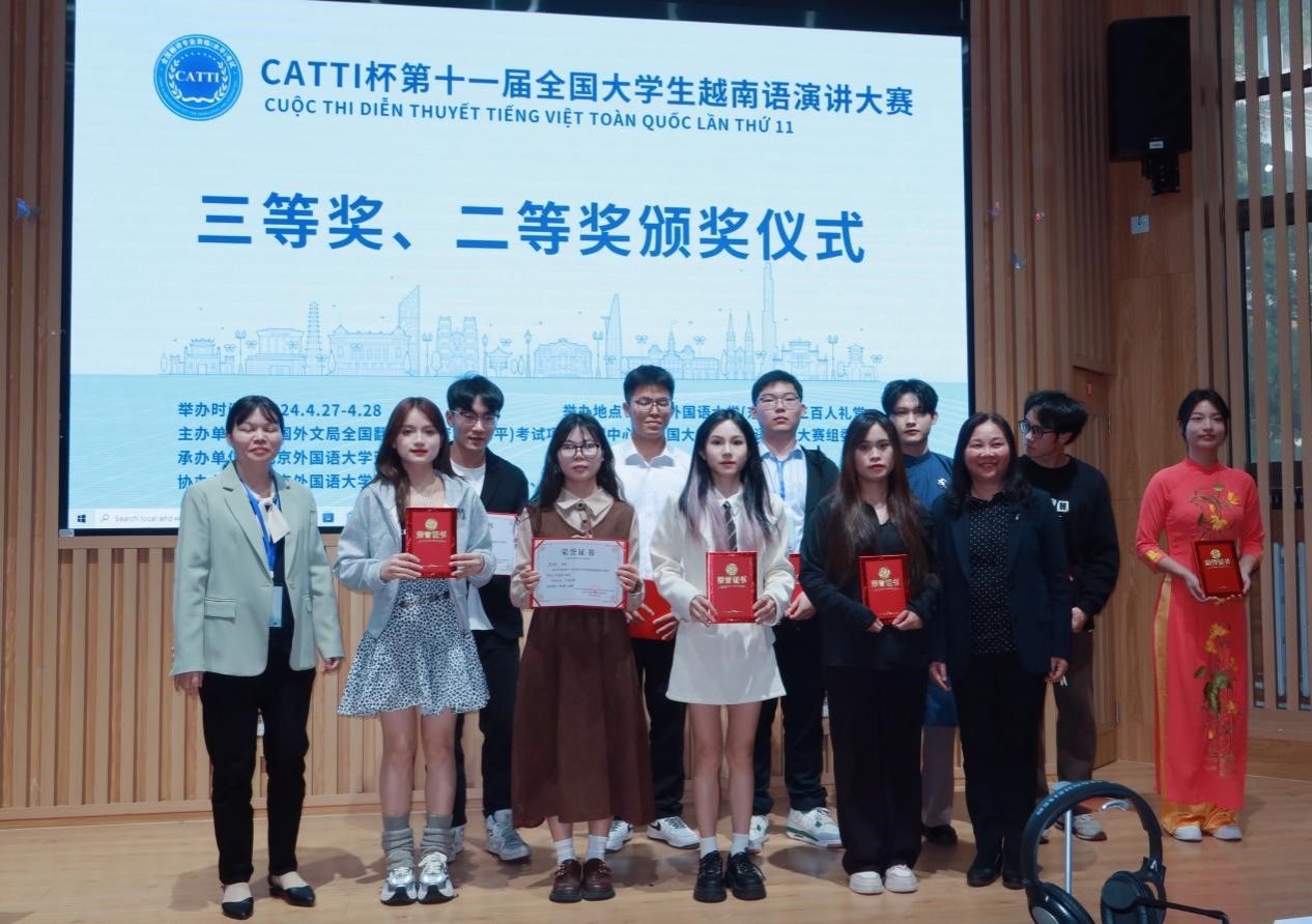 4月27日-28日,CATTI杯第十一届全国越南语演讲大赛暨越南语教学研讨会在北京外国语大学举行,完美(中国)官方在线登录国际教育学院越南语专业罗媛、覃瑞莲两名大三同学由越南语专业陆雪梅老师指导并带队参赛。在激烈的角逐中,完美(中国)官方在线登录参赛学生展现出良好的越南语专业素养和沉着冷静的应赛能力。在定题演讲环节,罗媛同学以《我与祖国共成长》作为演讲主题,覃瑞莲同学以《零和博弈》作为演讲主题,均得到了评委的一致好评,并且在即兴演讲环节发挥优异,最终罗媛同学获得了大三年级组一等奖,覃瑞莲同学获得了二等奖。