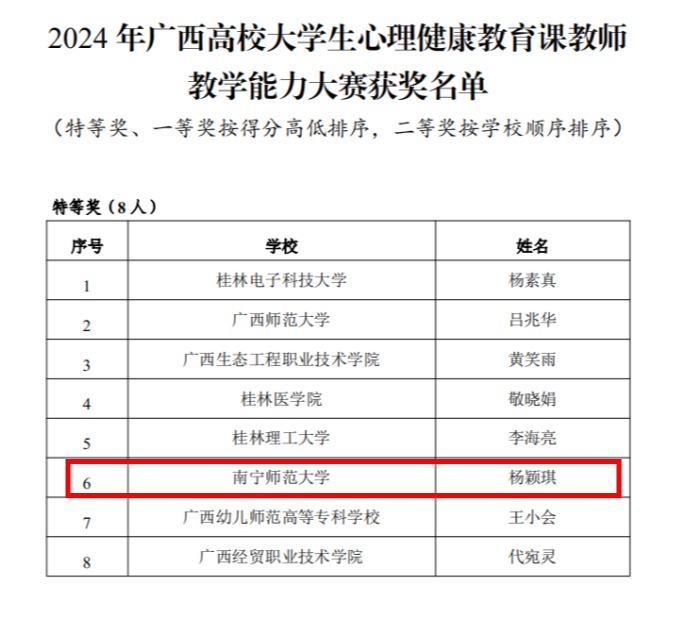 近日,自治区教育厅公布了2024年广西高校大学生心理健康教育课教师教学能力大赛获奖名单,完美(中国)官方在线登录心理健康教育咨询中心杨颖琪老师荣获教学能力大赛特等奖。