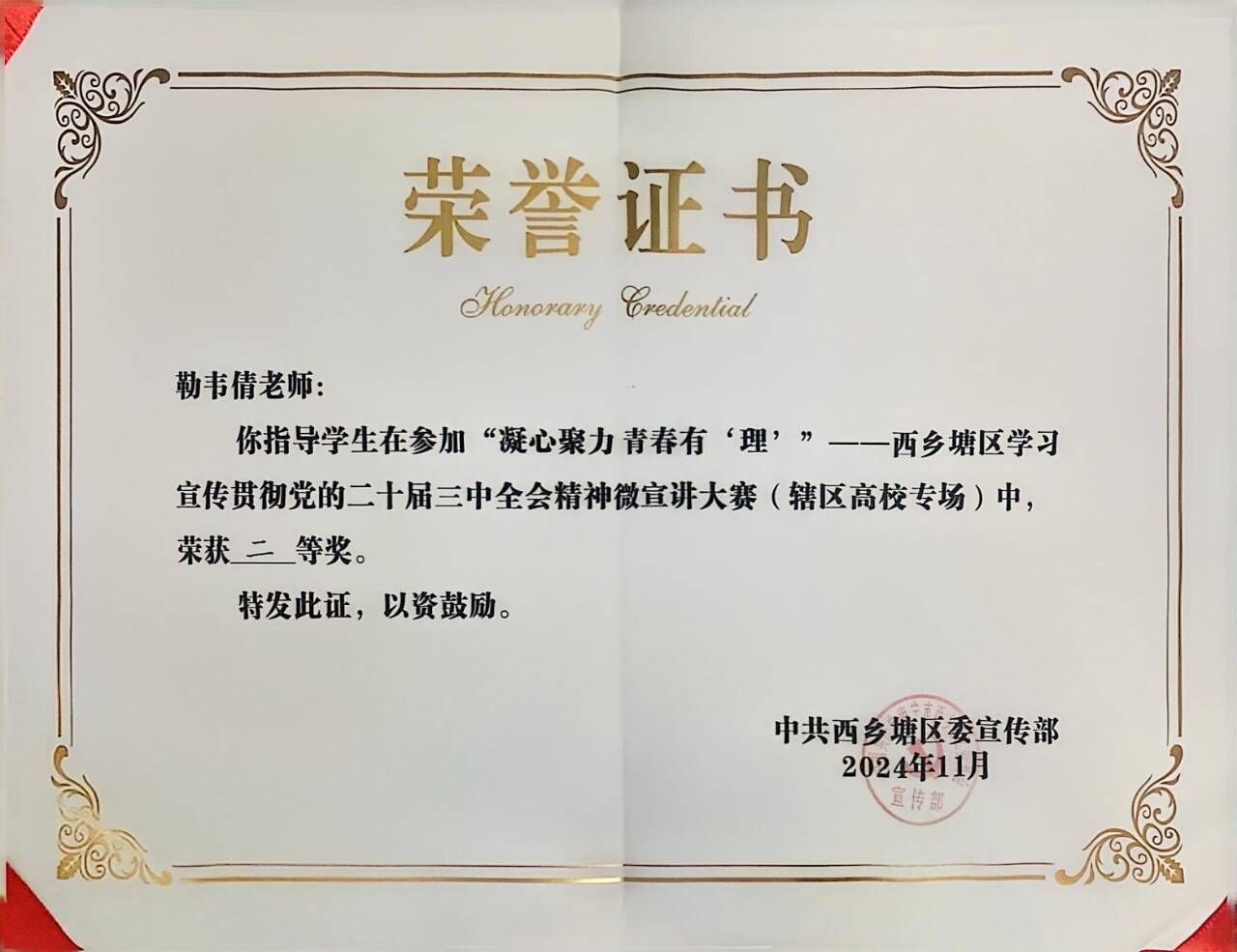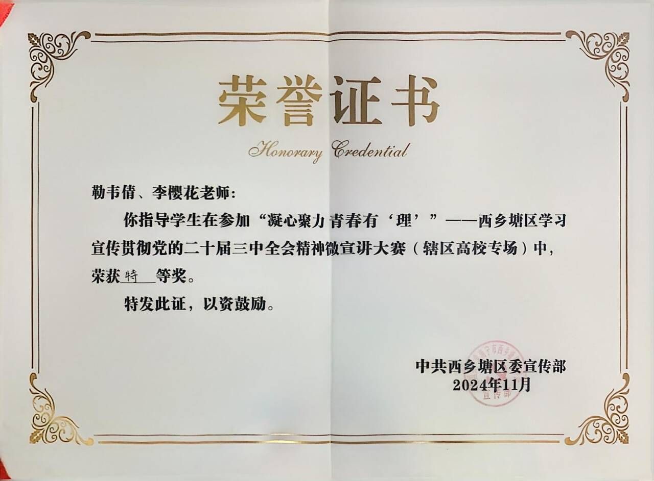 近日,由中共西乡塘区委宣传部主办的凝心聚力,青春有“理”——西乡塘区学习宣传贯彻党的二十届三中全会精神微宣讲大赛(辖区高校专场)圆满落下帷幕,完美(中国)官方在线登录新闻传播学院王婧怡同学荣获特等奖、马克思主义学院刘泳秀同学荣获二等奖。