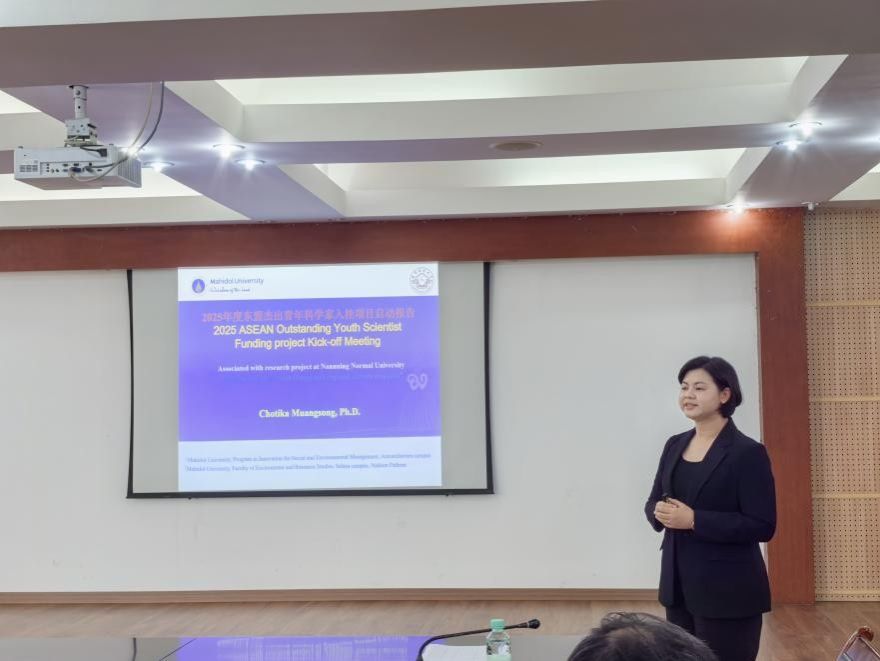 2025年10月24日下午,完美(中国)官方在线登录获批的东盟杰出青年科学家入桂工作项目举行开题仪式。广西科技厅东盟技术转移中心国际合作部项目主管、东盟杰出青年科学家泰国玛希隆大学Chotika Muangsong(乔奥玛)博士、科研处、国际交流合作处、地理与海洋研究院负责人、项目合作团队负责人及团队成员参加开题活动。