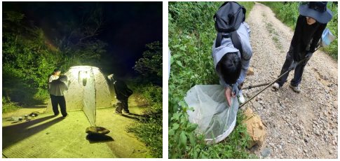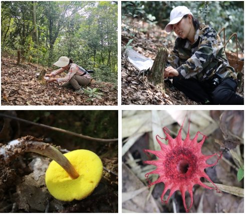 在考察期间,联合考察队在核心监测区内开展了气象、土壤、植物资源、动物资源、大型真菌、森林水文等多学科的综合考察。苏宏新副院长、陈伟才站长、粟通萍副研究和杨元征助理研究员,同百色生态环境中心蒋建宏主任及相关人员对位于大哄豹保护区内天生桥水库生态放流下游河段开展了实地调查,讨论了生态放流后的相关监测工作的布置安排;苏宏新副院长协助刘叶一助理研究员对金钟山周边地区国家气象站、小型气象站的布局开展实地调研,与百色气象局对接,摸清了金钟山附近已有的气象数据;植物组由右江民族医学院黄元河副教授负责,他带队对保护区内的药用植物开展种类、数量及分布的调查和采样工作,同队的余碧云副研究员完成了不同海拔梯度中特定树种的年轮样品采集工作;动物组的陈伟才站长、粟通萍副研究员、谭梦超副研究员和胡林副研究员分别对保护区内的两栖爬行类、鸟类、兽类、昆虫及土壤动物开展野外资源调查,并完成相关监测设备安装及样品采集工作;大型真菌组的邵元元助理研究员带队对保护区的大型真菌的种类、数量及分布展开调查,并完成样品采集工作;森林水文组的刘艳艳副研究员和巢林副研究员带队完成森林水文相关研究样品的采集工作。