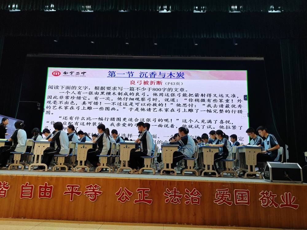 随后,师生共同观摩了由南宁市第二中学梁晶晶老师执教的《有生活作文才有真情》和覃莹莹老师执教的《有思考作文才有思想》两节课。梁晶晶老师从同学们的写作困惑出发,一步步引导同学们感悟生活,写出带有真情实感的文章。覃莹莹老师则从“沉香与木炭”材料出发,启发学生理解生活中的“沉香”和“木炭”,并引发学生对愿意做“沉香”还是愿意做“木炭”的思考,从而面对新的作文题目可以很好地建构自己的行文思路。