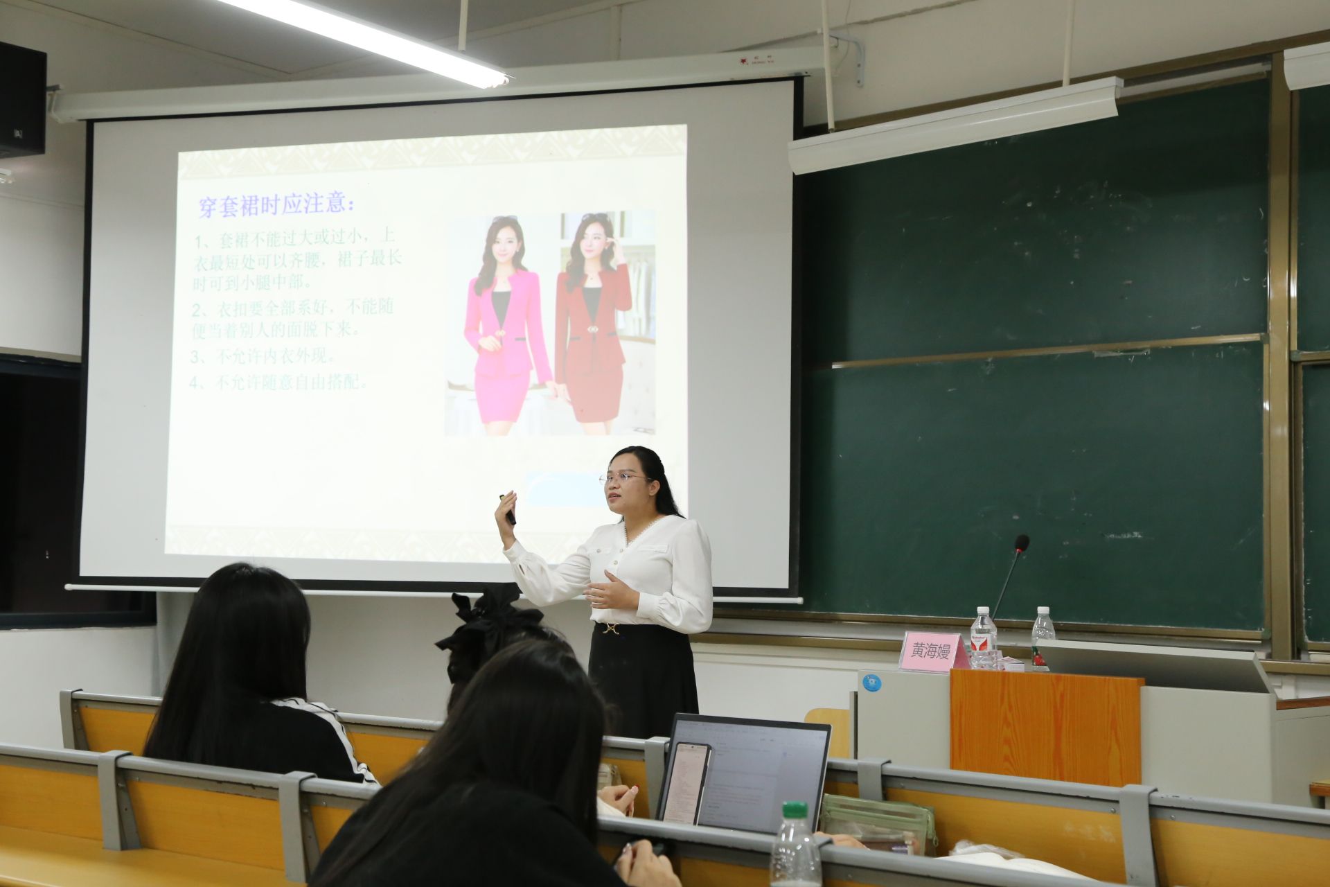 培训过程中,黄老师详细讲解了服装与仪容、介绍礼仪、握手礼仪、电话礼仪和接待礼仪等内容。她采用现场演示、案例分析等多样化教学方式,让知识更加生动易懂。此外,黄老师还邀请学生上台展示坐姿、站姿、握手等礼仪,并进行现场指导纠正,课堂氛围轻松活跃。