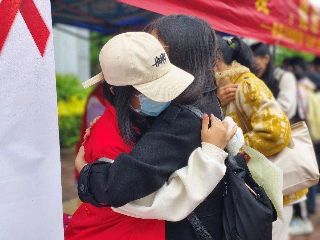 防艾留言板前,爱意流淌,希望满溢。同学们纷纷拿起笔,将对艾滋病患者的诚挚鼓励、对防艾事业的热切期望与坚定支持化作一行行温暖有力的文字,书写在留言板上,每一字句皆饱含着人性的光辉与善意。而在 “拥抱艾滋病人” 区域,真情互动令人动容。24 新闻班的黄芝桦同学化身 “艾滋病患者”,手举 “我是一位艾滋病患者,可以给我个拥抱吗?” 的醒目示意牌,诚挚邀请过往同学给予拥抱。当一个个温暖的拥抱接踵而至,不仅驱散了冬日的严寒,更传递出爱与接纳的强大力量。黄芝桦同学感慨道:“当有人主动拥抱我时,内心瞬间被一股暖流填满。拥抱不会传播艾滋,愿每一位艾滋病患者都能被世界温柔以待,收获满满的善意与温暖怀抱。”