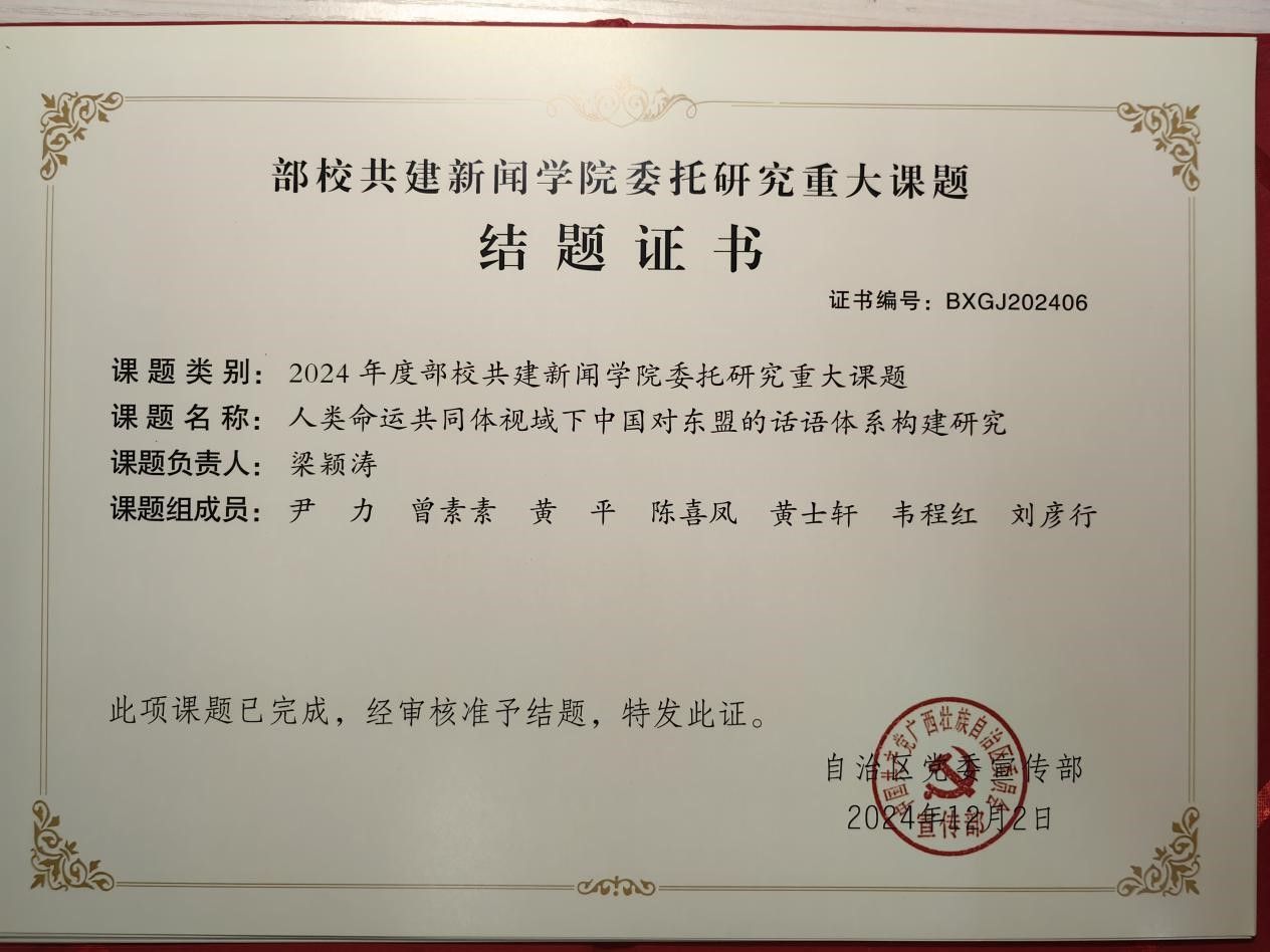 近日,新闻与传播学院梁颖涛教授主持的《人类命运共同体视域下中国对东盟的话语体系构建研究》课题,经过自治区党委宣传部的审核,顺利获得结题批准。该课题研究成果“指导思想明确、研究方法科学、研究过程规范、研究成果较突出,对实践工作具有较好的指导作用”。