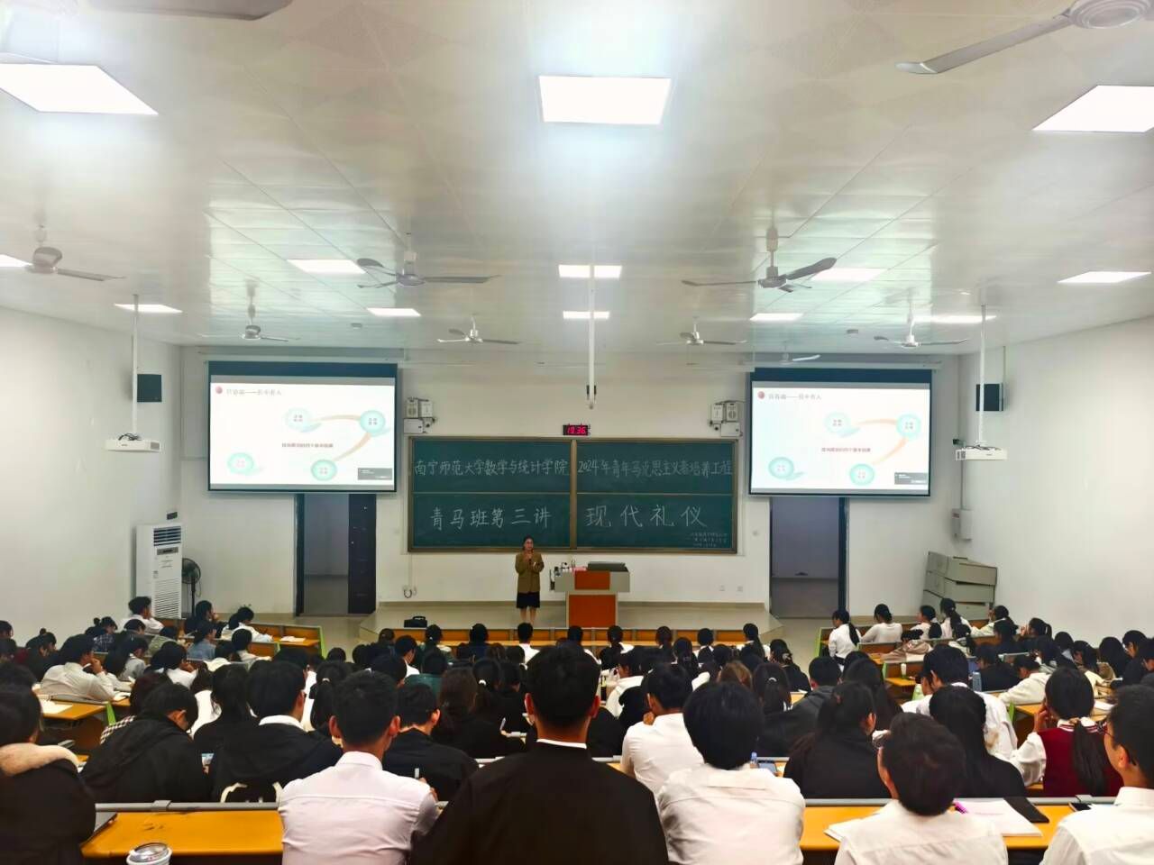 此次“青年马克思主义者培养工程”培训班共六讲,在理论授课环节中,余敢才以《学习贯彻党的二十届三中全会精神》为题,从党的二十届三中全会精神、习近平总书记系列重要讲话精神、进一步全面深化改革的总目标、贯彻“六个必须坚持”的原则等四个方面展开,分析了纷繁复杂的国内外形势,解读了社会主义制度的优越性,以及党的二十届三中全会继往开来的里程碑意义。付进以《新时代青年干部理想信念与担当作为》为题围绕“什么是学生干部?”、“为什么当学生干部?”以及“怎么做学生干部?”三个问题,从学生干部的重要作用、需要具备何种能力、学生干部的现状和如何提升能力素质这四个方面为同学们详细讲解学生干部如何践行自我价值、发挥榜样示范作用,践行挺膺担当的青春誓言。梁卡霖以《浇花先浇根,育人先育心——学生干部心理健康素养提升》为题进行授课,她通过多个心理健康教育的实例进行分析,深入浅出地讲解了心理健康素养基本概念和重要性,以及如何识别和应对常见的心理问题,还分享了多种实用的心理调适技巧与提升学生干部专业能力的途径。旅游与文化学院团委书记莫秋桂以《现代礼仪》为题,通过展现现代礼仪的特点和原则,解读了礼仪的深刻内涵,并通过现场示范教学,让同学们对礼仪标准有了更清晰的认识。学院辅导员张硕老师以《新时代大学生审美价值观》为题,围绕什么是审美、审美的重要意义,以及新时代大学生审美价值观的时代诉求三个方面进行了讲解,进一步提升学员们的审美认知,提升审美能力。培训实践环节,学院组织学员们前往广西壮族自治区博物馆开展研学活动,带领学员们感受历史的厚重、触摸文化魅力,增强学员们的文化自信,铸牢中华民族共同体意识,更加坚定了传承和弘扬中华优秀文化的信念。