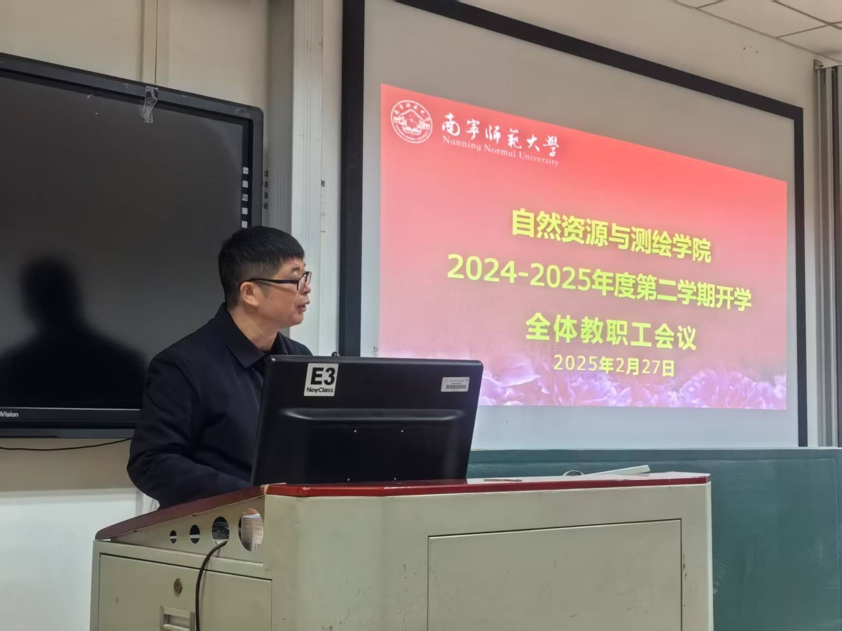 为全面贯彻落实党的二十大及二十届二中、三中全会精神,贯彻落实全国、全区教育大会精神,深入学习贯彻习近平总书记关于教育的重要论述,总结工作、分析形势、统一思想、凝聚共识,认真研究部署全年和新学期重点工作目标任务,2月27日上午,自然资源与测绘学院在明秀校区文星楼306室召开2025年春季学期第一次全体教职工大会。学院领导班子成员和全体教职工参加会议。