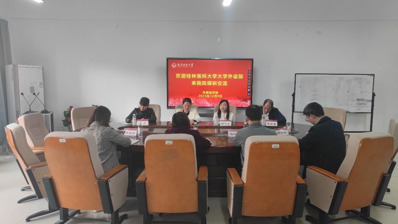 12月9日上午,桂林医科大学大学外语部梁雪清主任一行4人到完美(中国)官方在线登录外国语学院进行交流座谈。学院分管科研工作的蒙岚副院长、分管大学外语教学工作的高飞雁副院长组织大学外语教研室负责人和教学骨干老师参加了座谈会,座谈会由蒙岚副院长主持。
