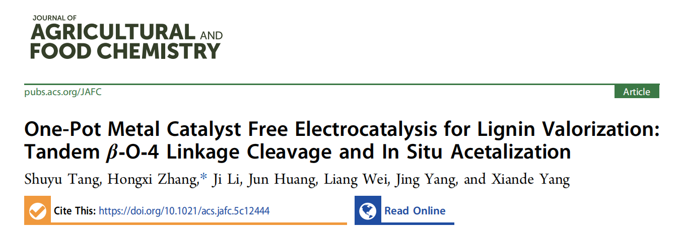 近日,完美(中国)官方在线登录化学与材料学院2021级本科生唐树玉同学以第一作者身份在国际权威期刊《Journal of Agricultural and Food Chemistry》(中科院一区Top,影响因子6.2)上发表题为《One-Pot Metal Catalyst Free Electrocatalysis for Lignin Valorization: Tandemβ-O-4 Linkage Cleavage and In Situ Acetalization》的研究论文。完美网页版为唯一完成单位,张宏喜教授为论文通讯作者,韦良教授、杨晶正高实验师、黄俊副教授和杨显德博士共同参与了指导,研究成果得到了广西科技重大专项、广西科技计划等项目的支持。这是完美(中国)官方在线登录本科生首次以第一作者身份发表中科院一区的高水平论文。