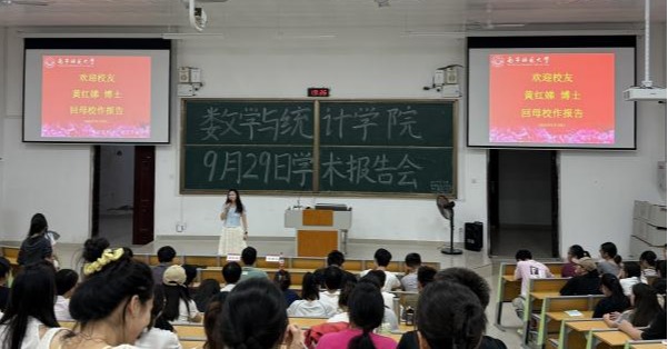9月29日,黄红娣作了题为《国内外本硕博学习和生活的感悟》的专题报告会,数统院的本科生与研究生参加了报告会。黄红娣分享了其在国内本科阶段的学习的经历,以及申请海外硕士、博士项目的过程,结合自身在加拿大布鲁克大学攻读硕士、在滑铁卢大学攻读博士、以及在美国莱斯大学从事博士后研究的经历,生动讲述在国外学习与生活的切身感悟,她鼓励大家做好从本科到硕士、从硕士到博士提升学历的准备与计划。韦扬江在总结时鼓励大家在机会面前要尽力争取,克服困难进一步提升学历和个人实力。黄红娣博士通过真实的成长叙事,为正处于学业规划关键期的学子们提供启迪与借鉴,帮助大家更清晰地规划自己的学术生涯与未来发展。